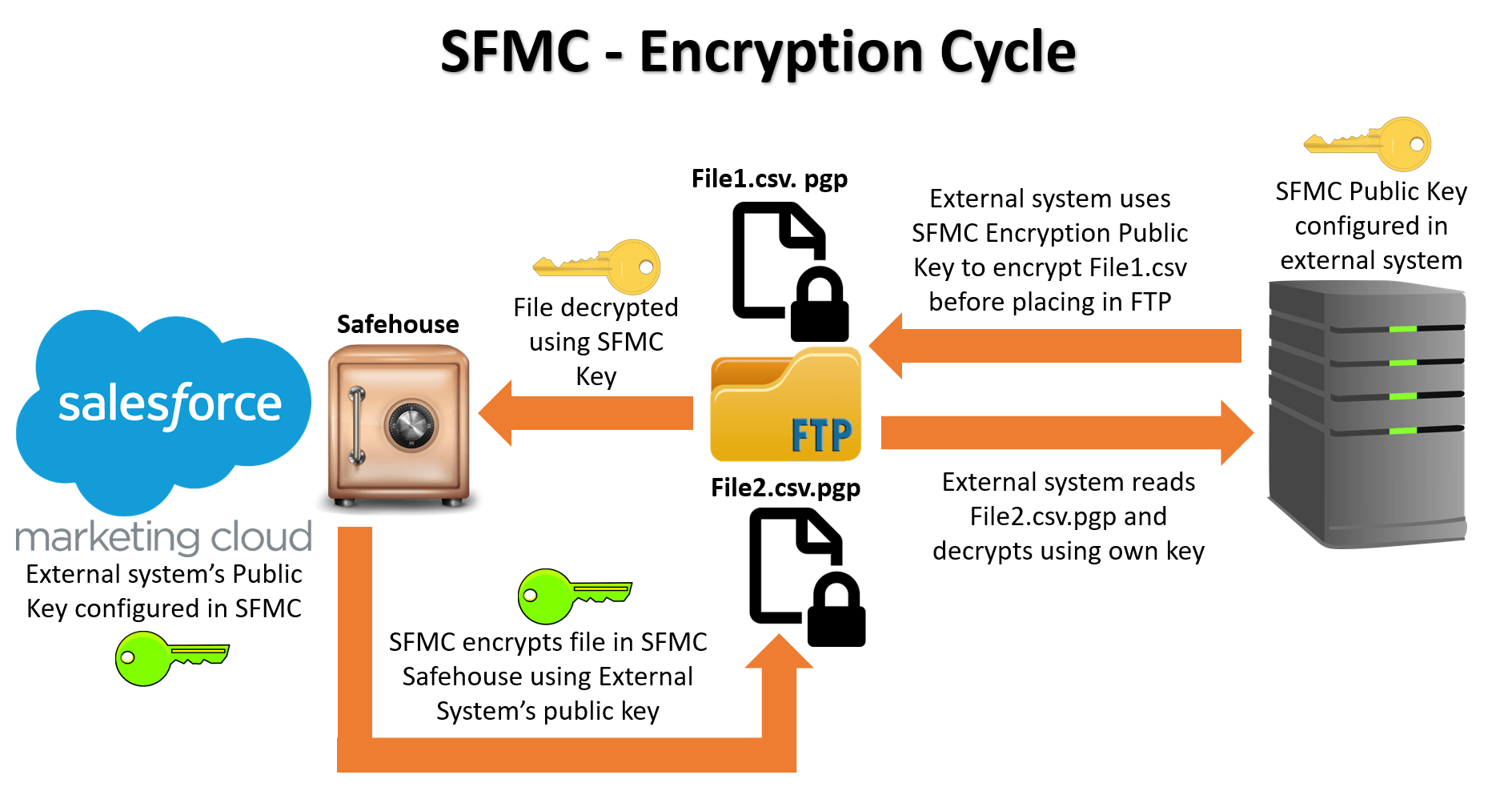 Learn how to use encryption (PGP) both in external systems as well as in Marketing Cloud. Useful references: